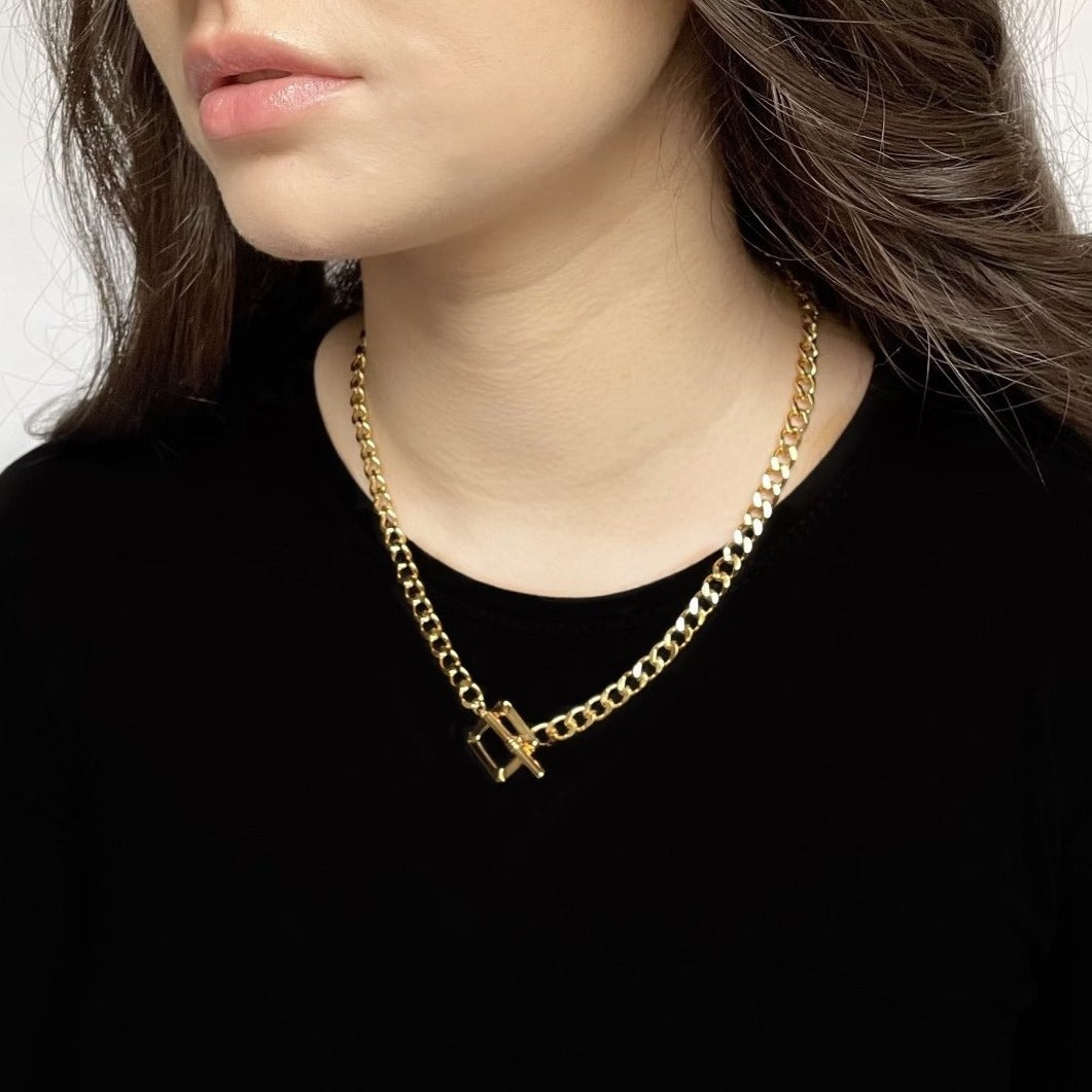 Elevate your style with the novélle Signature Necklace, a bold and elegant accessory designed to make a statement. Featuring a distinctive square t-bar clasp, this handcrafted necklace combines high-grade stainless steel with luxurious 18k gold plating for enduring shine. Engineered for durability, it resists tarnishing and is perfect for sensitive skin, backed by a 2-year warranty. Complete your look with matching pieces from our collection. Length: 20 inches [51cm] Width: 6.5mm.