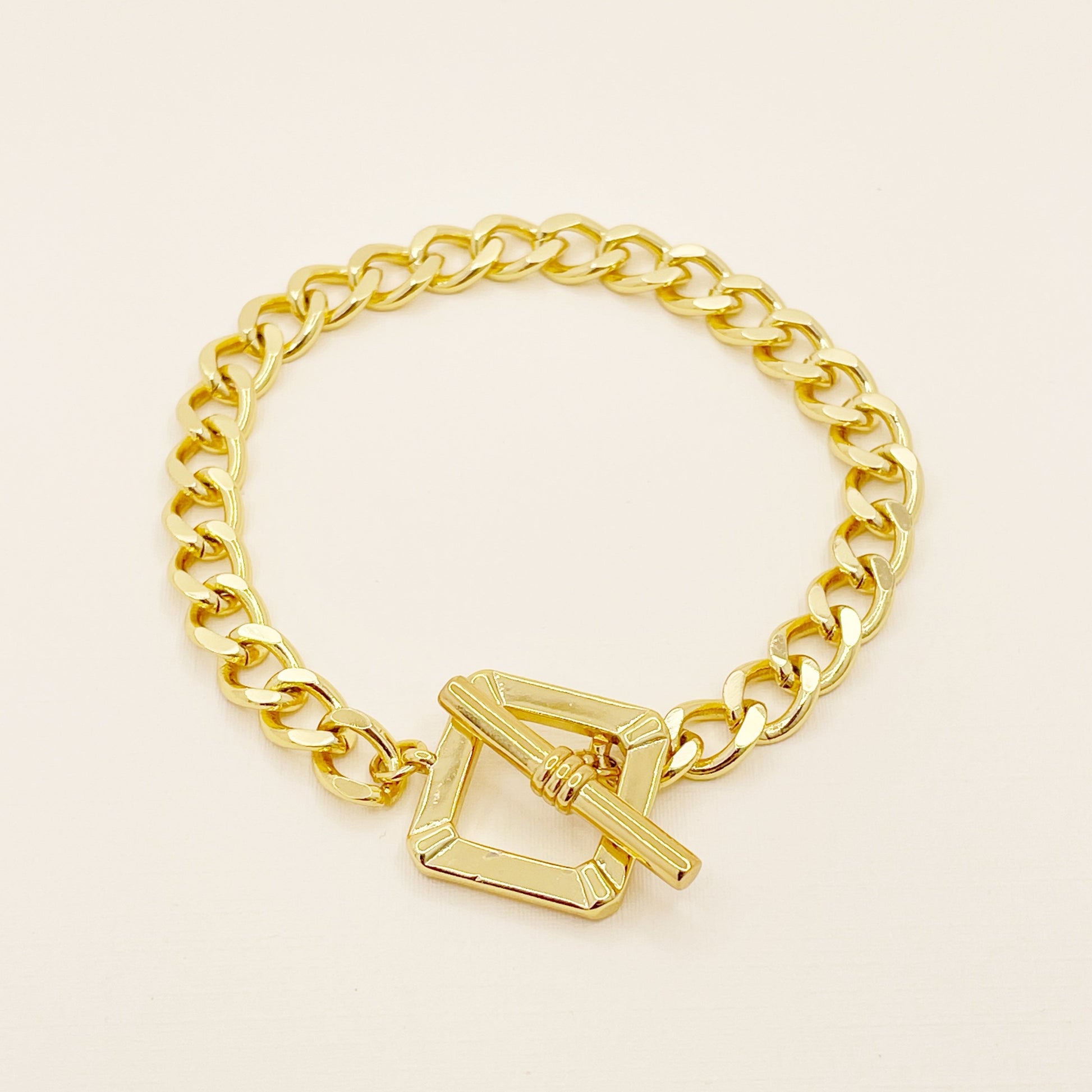 Introducing the novélle Signature Bracelet - a striking accessory that elevates any outfit. Featuring a unique square t-bar clasp, this bracelet is a versatile addition to your jewelry collection. Handcrafted from high-grade stainless steel and beautifully plated in 18k gold, it promises durability and a brilliant shine. Designed to withstand tarnishing and safe for sensitive skin, this piece comes with a 2-year warranty, ensuring it’s made to last. Length: 18cm | Width: 0.5cm.